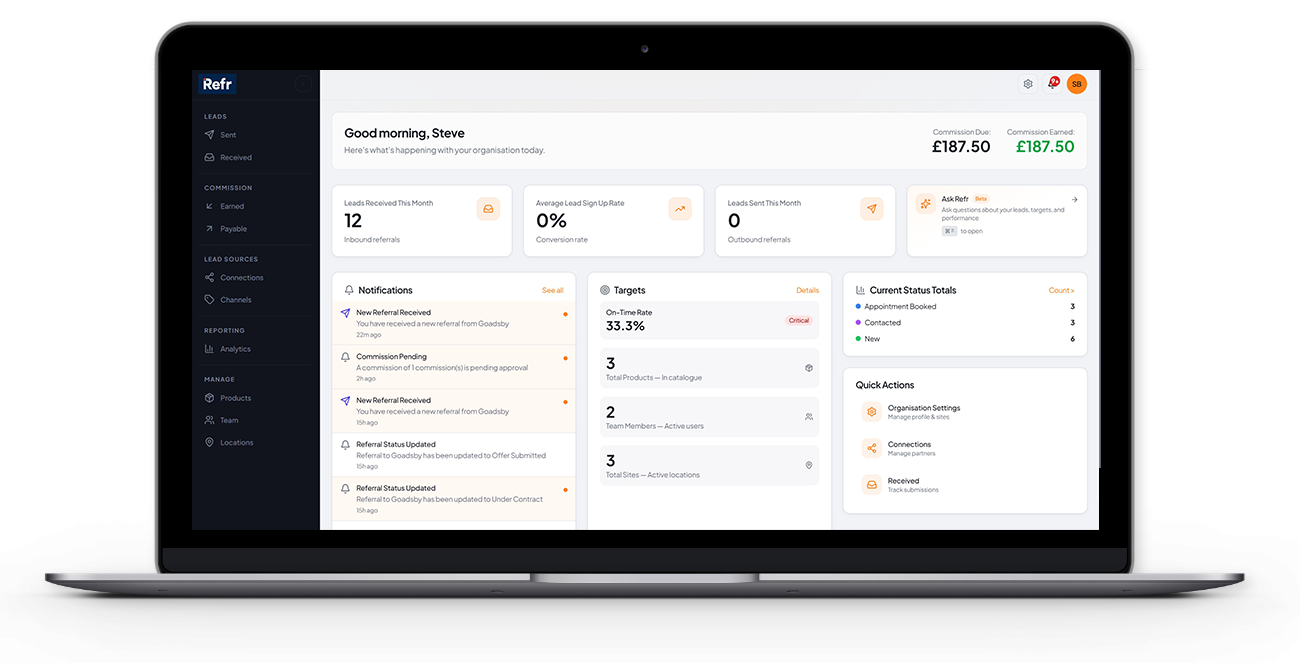 Refr gives you a simple, transparent way to manage every lead, every update, and every commission – all in one place. Stop using spreadsheets and start understanding your conversions.